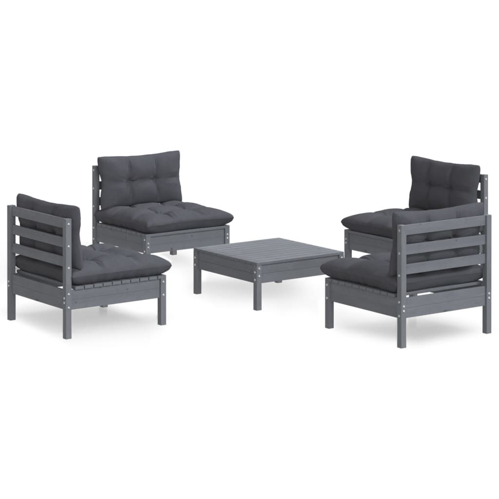 vidaXL 5-daļīgs dārza mēbeļu komplekts ar pelēkiem matračiem, priede