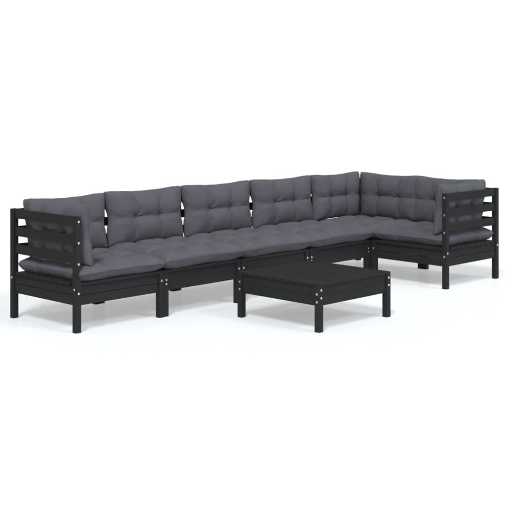 vidaXL 7-daļīgs dārza mēbeļu komplekts ar matračiem, melna priede