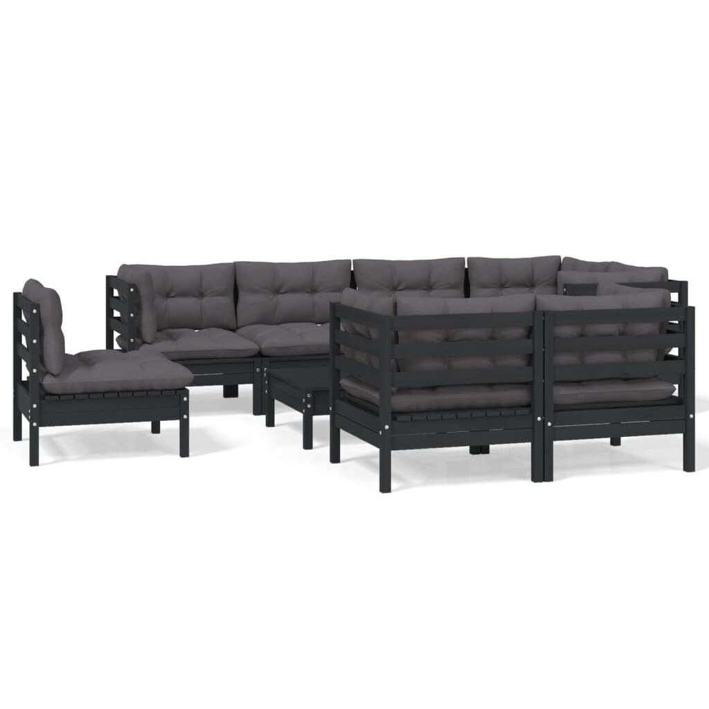 vidaXL 9-daļīgs dārza mēbeļu komplekts ar matračiem, melna priede