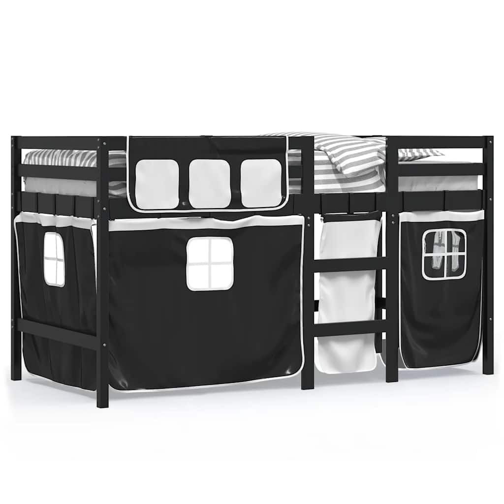 vidaXL bērnu gulta ar aizkariem, melni ar baltu, 80x200 cm, priede