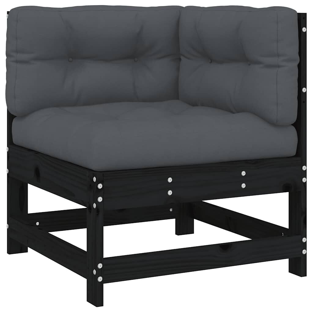 vidaXL stūra dīvāns ar matračiem, melns priedes masīvkoks