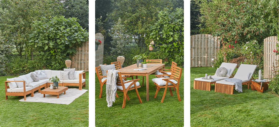 Izvēlētā koka tekstūra un šķiedras jūsu dārza iekārtojumam piešķirs dabisku šarmu. Noteikti sargiet savas mēbeles no laikapstākļiem, glabājot vai pārsedzot tās. Lai tās izskatītos kā jaunas, ieteicams mēbeles regulāri eļļot vai vaskot.